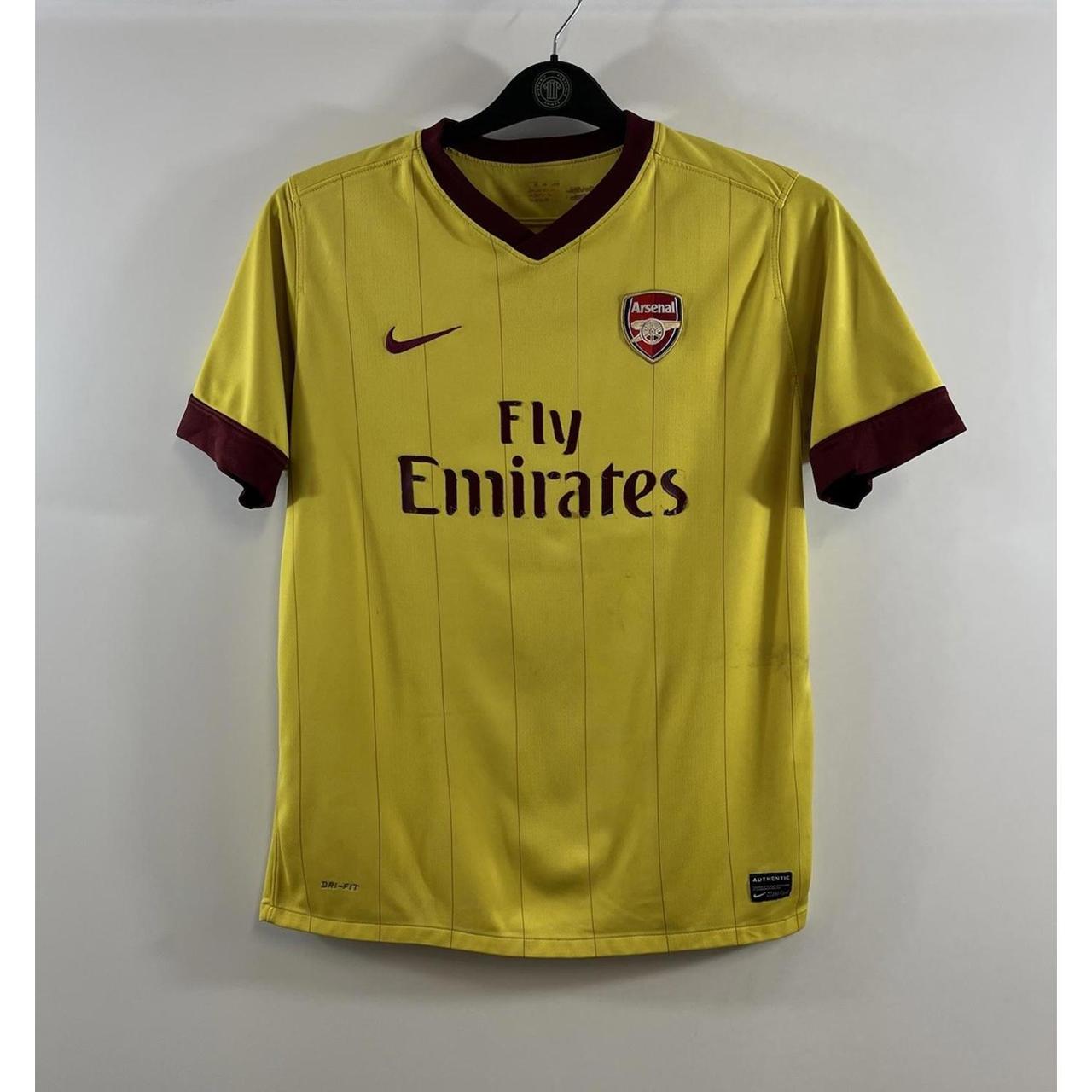 Arsenal Away Football Shirt 2010/13 Children’s XL Boys Nike I268 Arsenal Away Football Shirt 2010/13 Children’s XL Boys Nike I268 Away Shirt – official Nike team shirt product Away shirt as worn when Arsenal finished 3rd, 4th and 3rd respectively in the Premier League and made it to the 2011 League Cup final where they lost 2-1 against Birmingham City after a 89th minute Obafemi Martins winner. They also proved to be unsuccessful in the Champions League, being knocked out in the last 16 in all 3 seasons, losing against Barcelona, AC Milan and Bayern Munich respectively. 2010/13 Size Children’s XL Boys Pit to pit 19 inches Collar to hem 27 inches Fair Condition damaged sponsor (see pictures) Postage: All products are shipped double bagged in durable waterproof plastic envelope