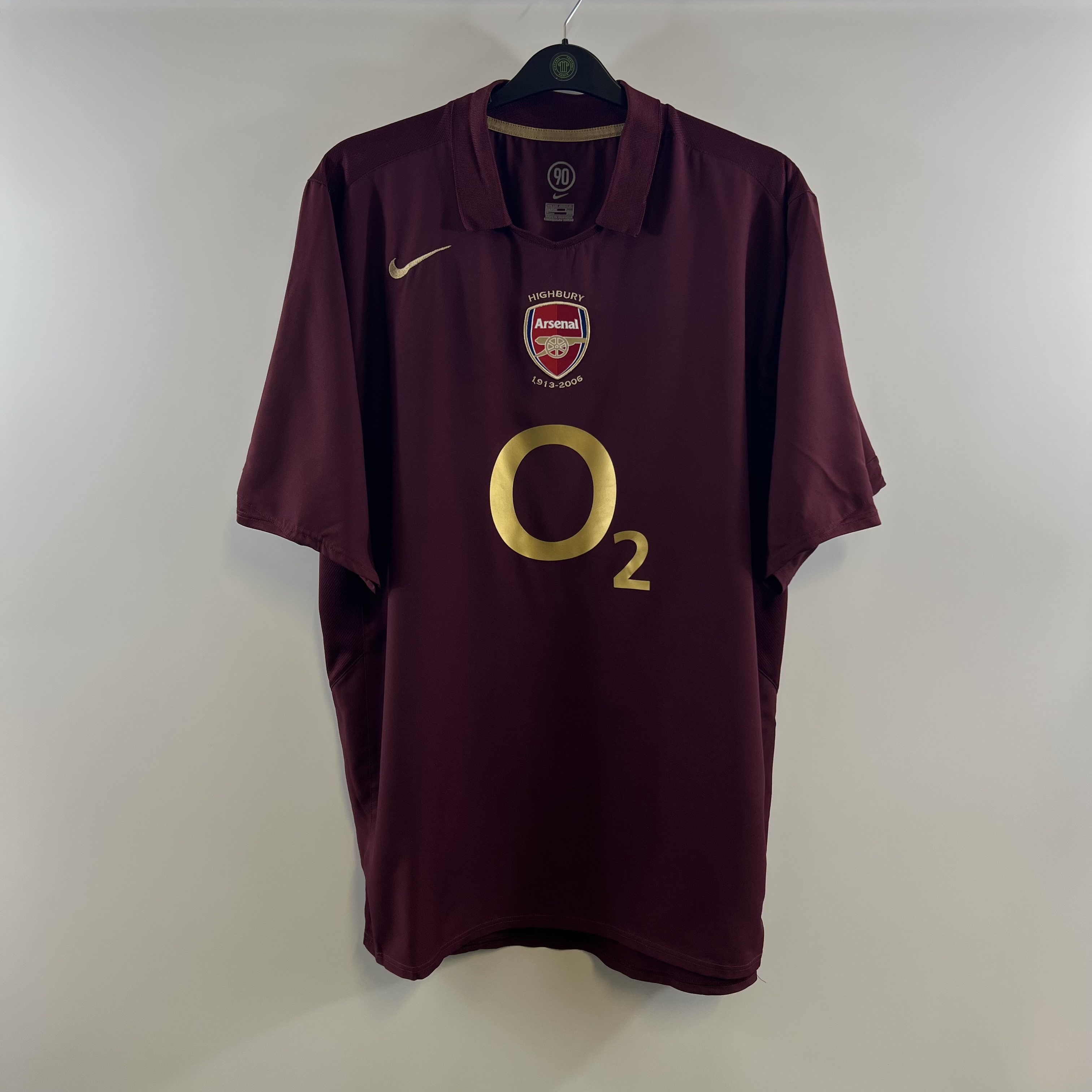 Redcurrant home shirt worn when the side ensured qualification for the Champions League at the expense of bitter rivals Tottenham. A Thierry Henry hat-trick secured a 4-2 victory over Wigan with Henry celebrating by kissing the Highbury turf goodbye. The side also played in their first ever Champions League Final.