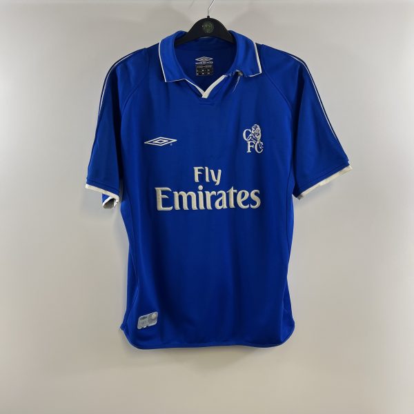 Home shirt as worn over two seasons. The first saw Claudio Ranieri take charge of his first full season as manager which saw him lead the club to a 6th place finish for the second season running. The following season saw the side finish 4th in the Premier League and qualify for the Champions League. Also worn in the 2002 FA Cup final where Chelsea lost 2-0 against Arsenal with goals from Ray Parlour and Freddie Ljungberg.