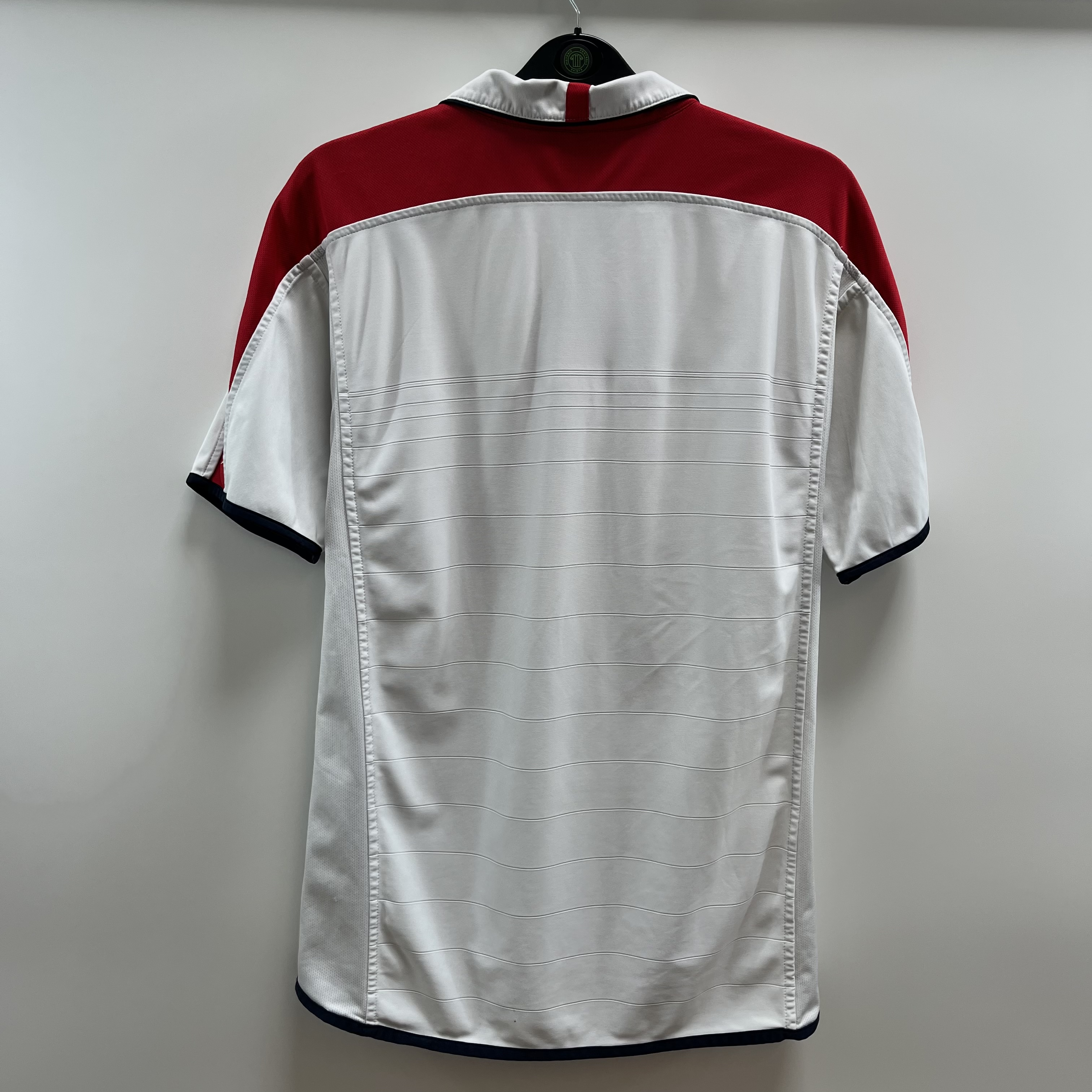 Home shirt as worn at Euro 2004 where the side reached the Quarter-Finals under boss Sven-Göran Eriksson but lost out to Portugal on penalties. David Beckham and Darius Vassell missed their kicks it was the Portuguese goalkeeper Ricardo who stepped up and knocked England out.