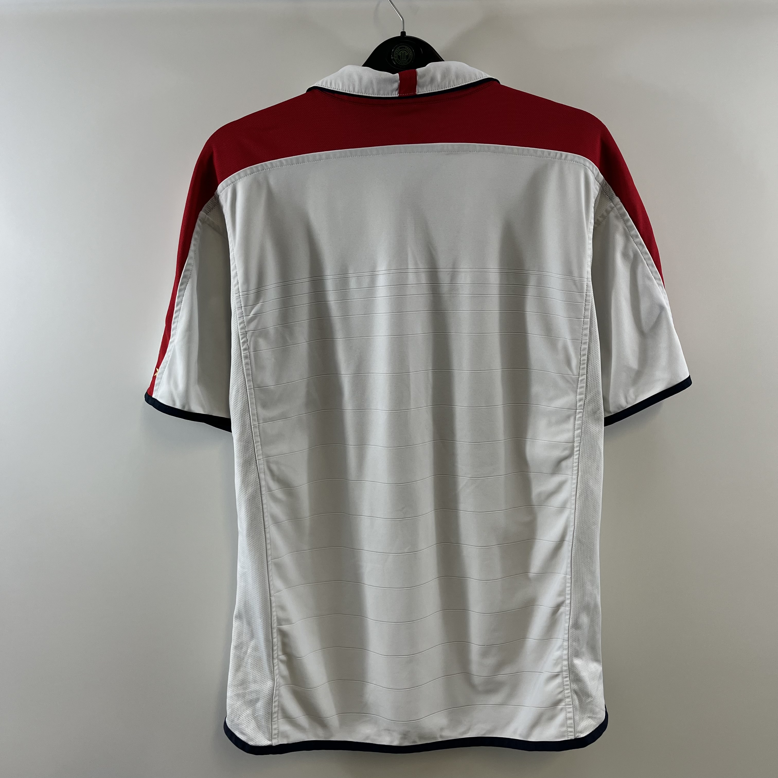 Home shirt as worn at Euro 2004 where the side reached the Quarter-Finals under boss Sven-Göran Eriksson but lost out to Portugal on penalties. David Beckham and Darius Vassell missed their kicks it was the Portuguese goalkeeper Ricardo who stepped up and knocked England out.
