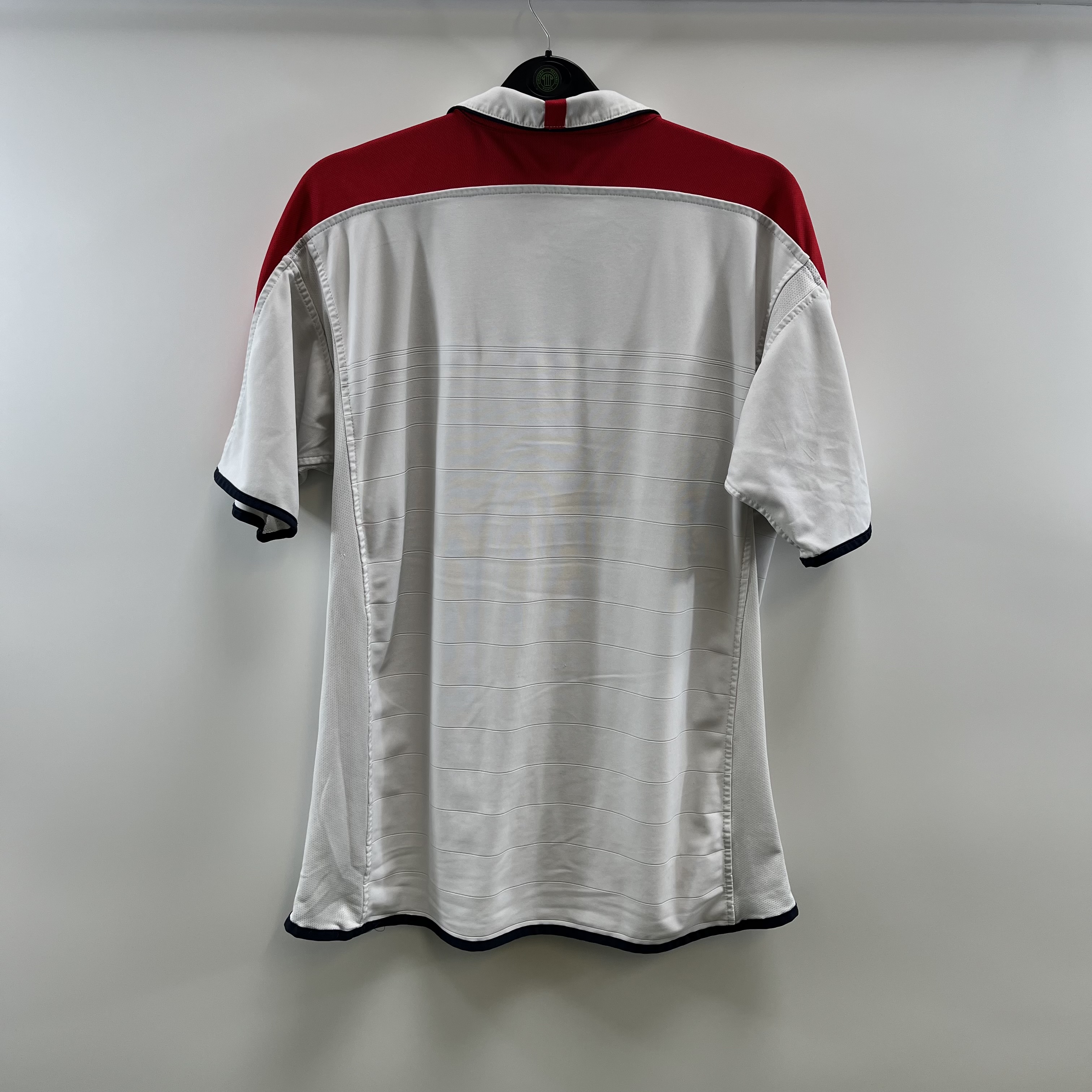 Home shirt as worn at Euro 2004 where the side reached the Quarter-Finals under boss Sven-Göran Eriksson but lost out to Portugal on penalties. David Beckham and Darius Vassell missed their kicks it was the Portuguese goalkeeper Ricardo who stepped up and knocked England out.