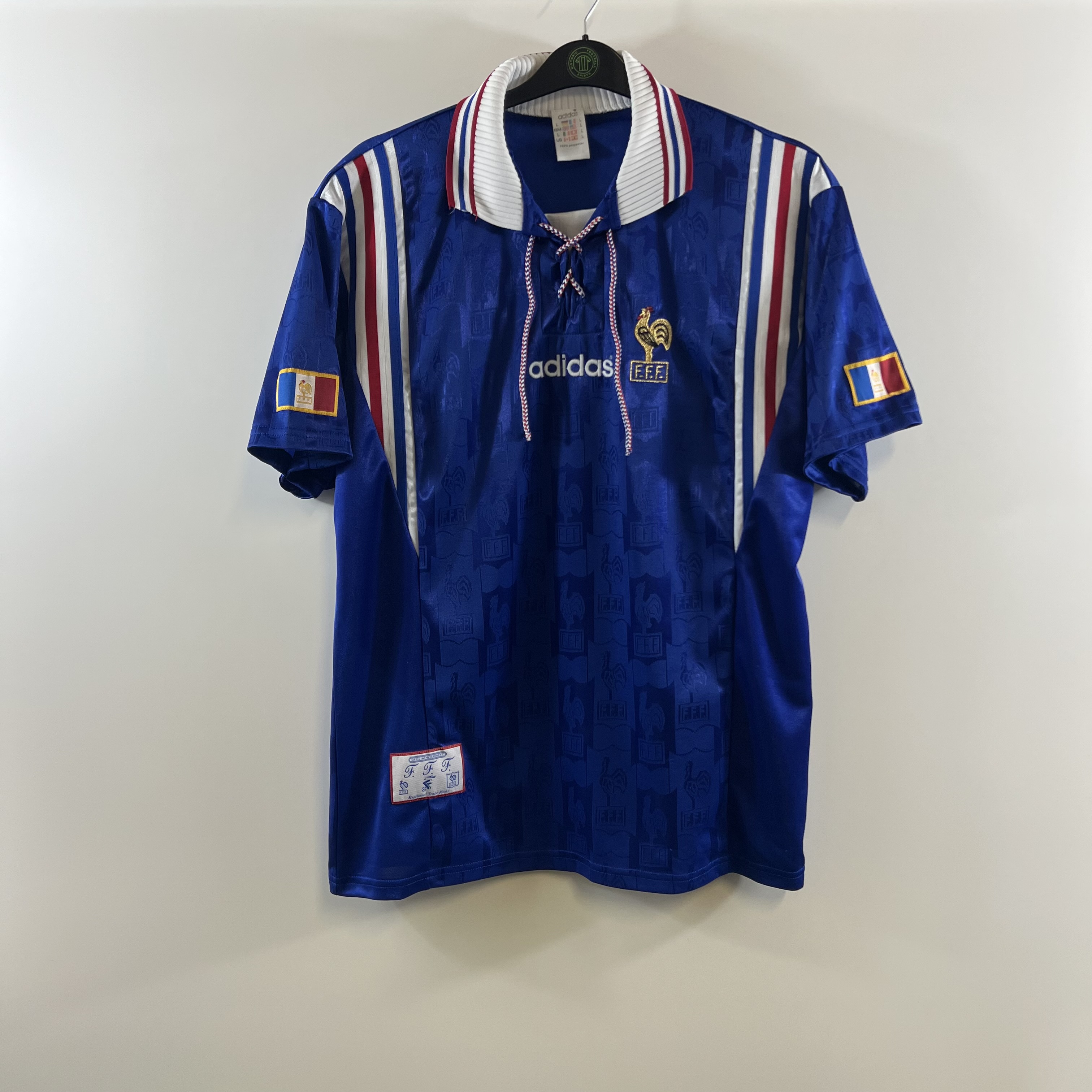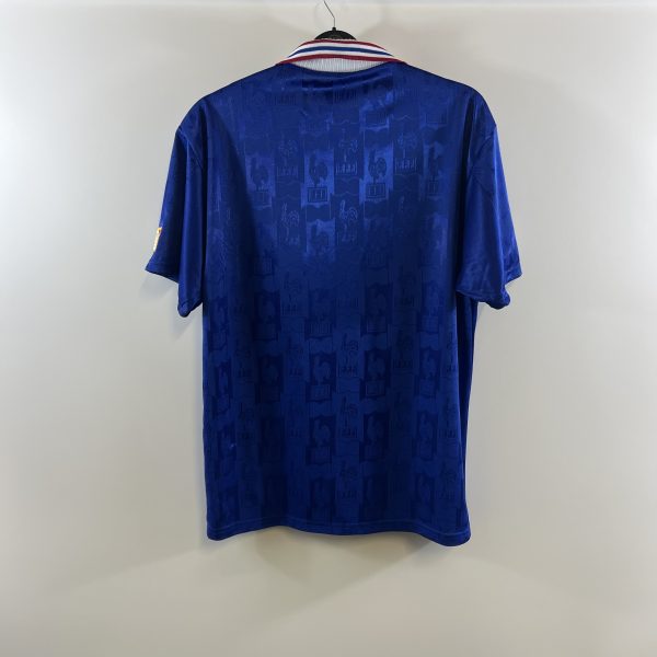 Classic design lace-neck home shirt as worn at Euro 96 when Aime Jacquet’s side reached the Semi-Finals, sowing the seeds for their successes in 1998 and 2000.