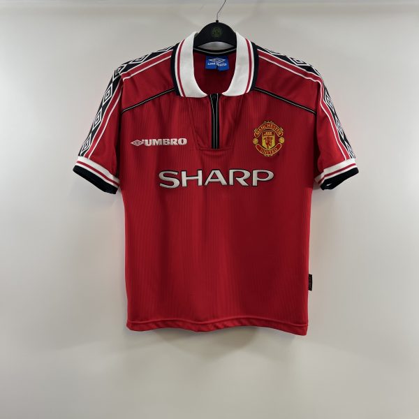 Famous home shirt as worn in the glorious 98-99 Treble season when Alex Ferguson guided the Red Devils to the promised land with triumphs in the Premiership, FA Cup and champions league.