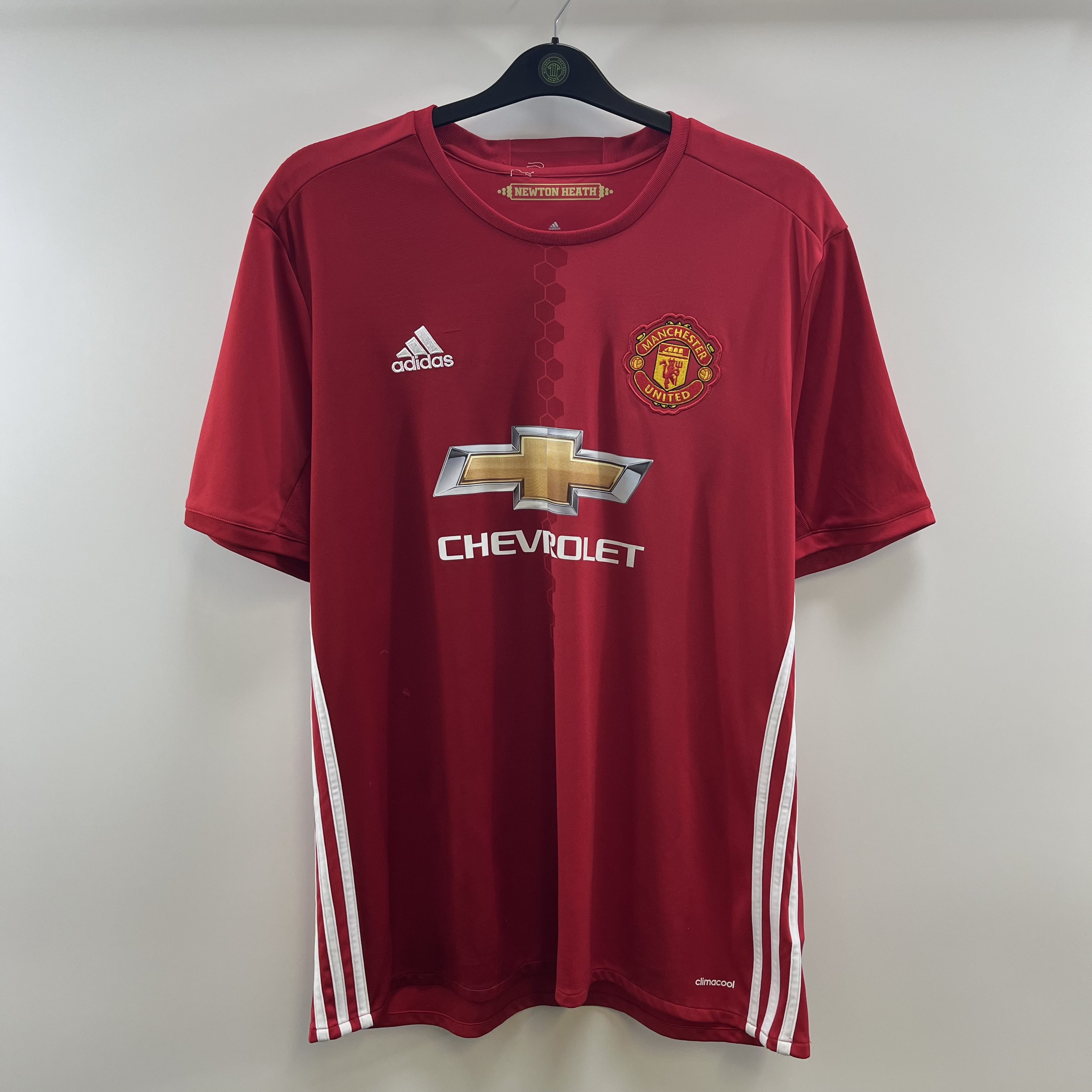 Home shirt worn as Jose Mourinho took over the reigns at Old Trafford with high expectations following the World record transfer of French international and former youth team product Paul Pogba but would eventually settle for a League Cup and Europa League double, the latter triumph meaning United have now won every trophy available.