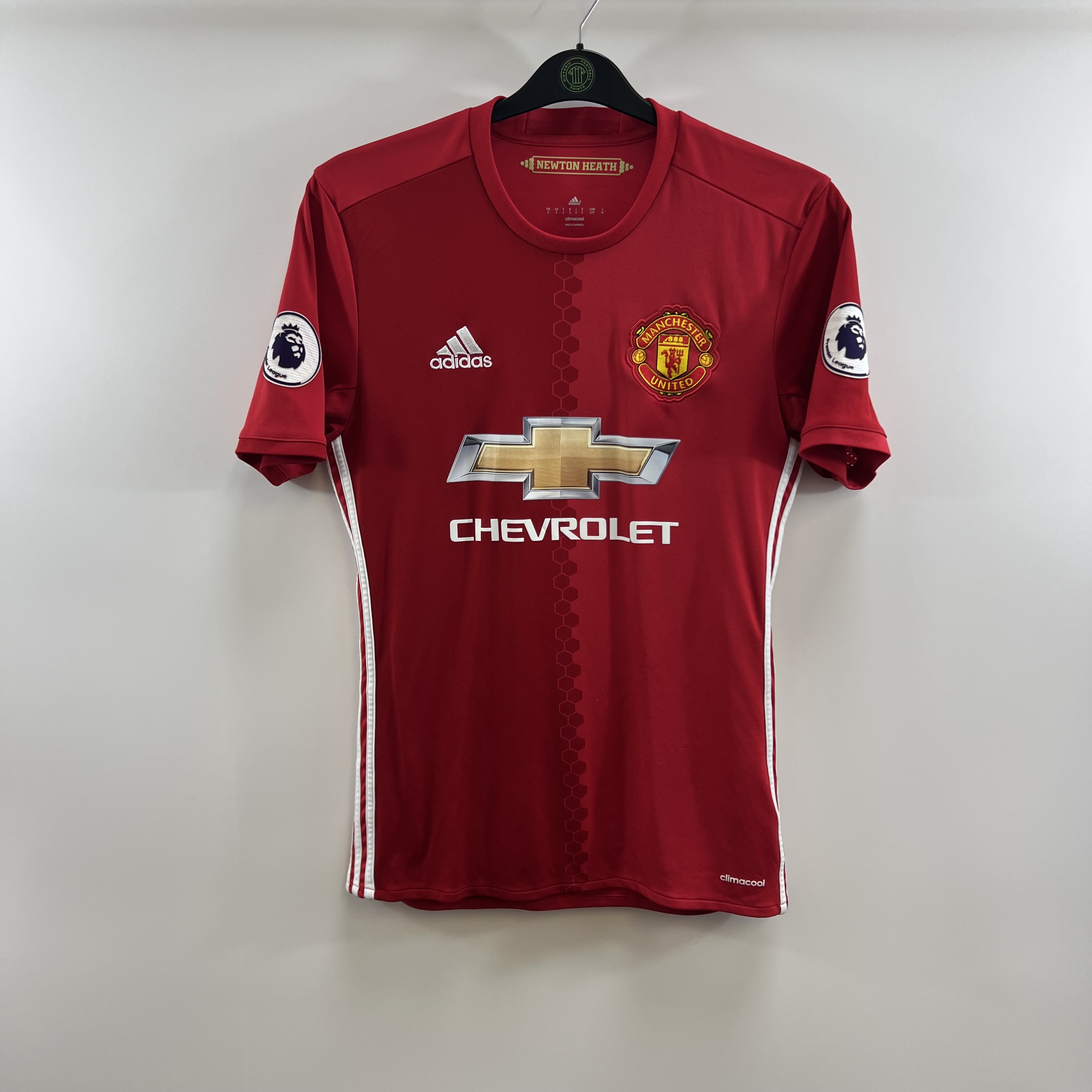 Home shirt worn as José Mourinho took over the reigns at Old Trafford with high expectations following the World record transfer of French international and former youth team product Paul Pogba but would eventually settle for a League Cup and Europa League double, the latter triumph meaning United have now won every trophy available