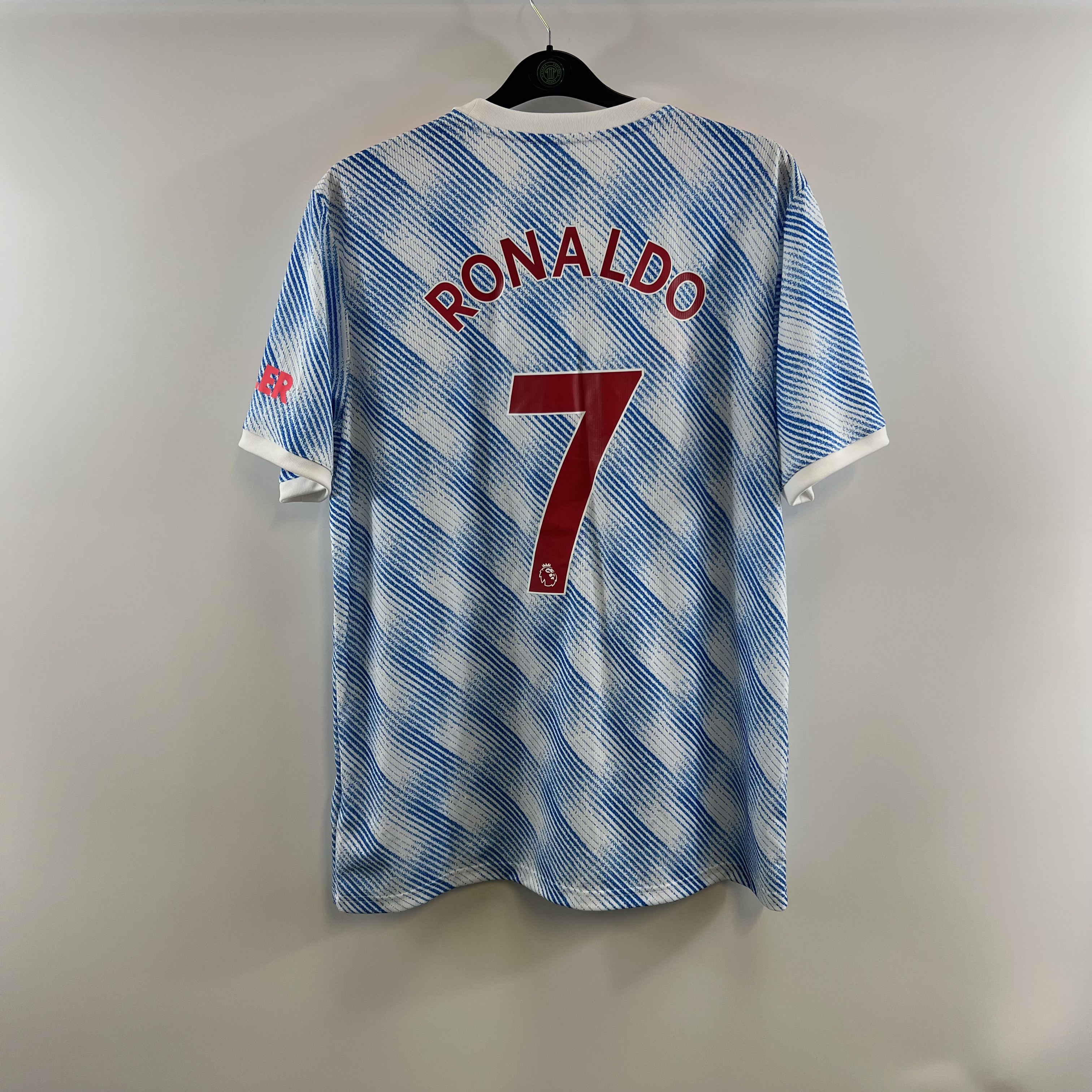 Official Premier League print for all-time great forward Cristiano Ronaldo #7 official sleeve patches.