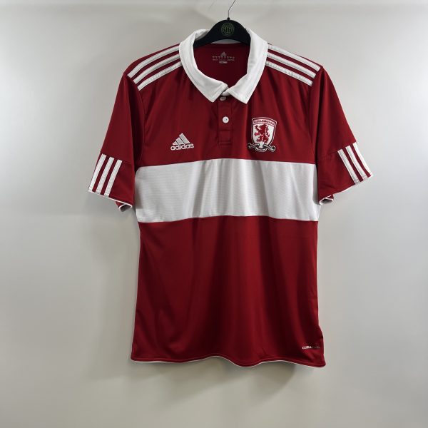 Home shirt as worn when Tony Mowbray took over from Gordon Strachan and guided Boro away from the relegation zone to a 12th place finish thanks to some great late season form. In this campaign the side did not secure a regular sponsor so instead offered short-term packages throughout the season.