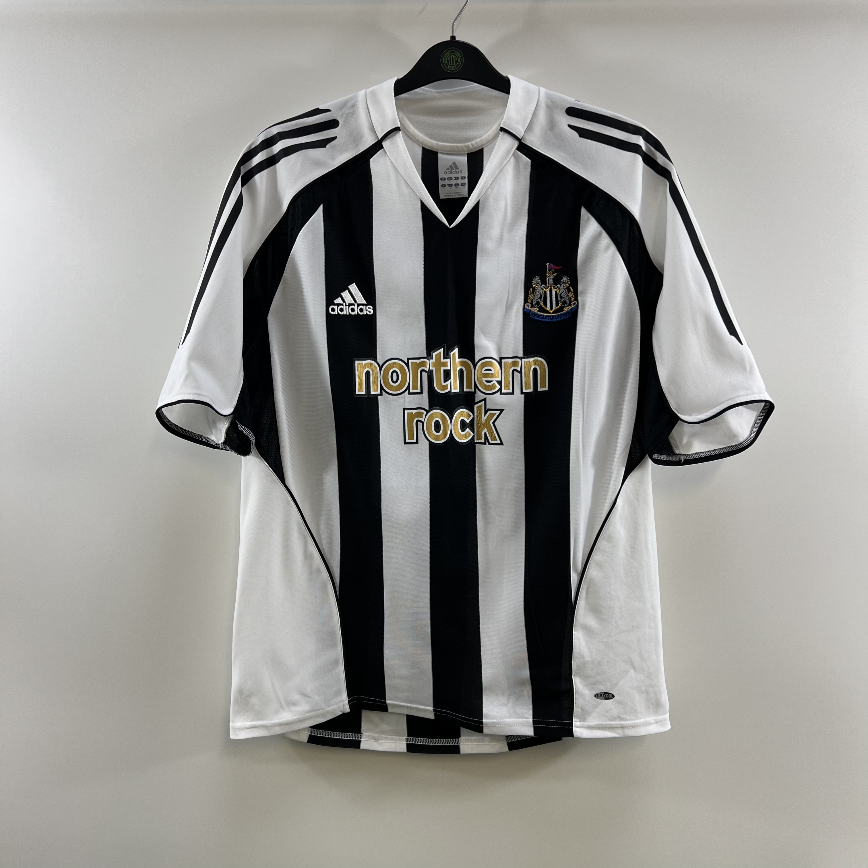 Home shirt as worn when Newcastle finished 7th and 13th respectively in the Premier League and were knocked out in the quarter finals of the 2005-06 FA Cup, losing 1-0 against Chelsea. Also worn when Newcastle were knocked out in the last 16 of the 2006-07 UEFA Cup, being knocked out on away goals against AZ Alkmaar after the tie finished 4-4 on aggregate.