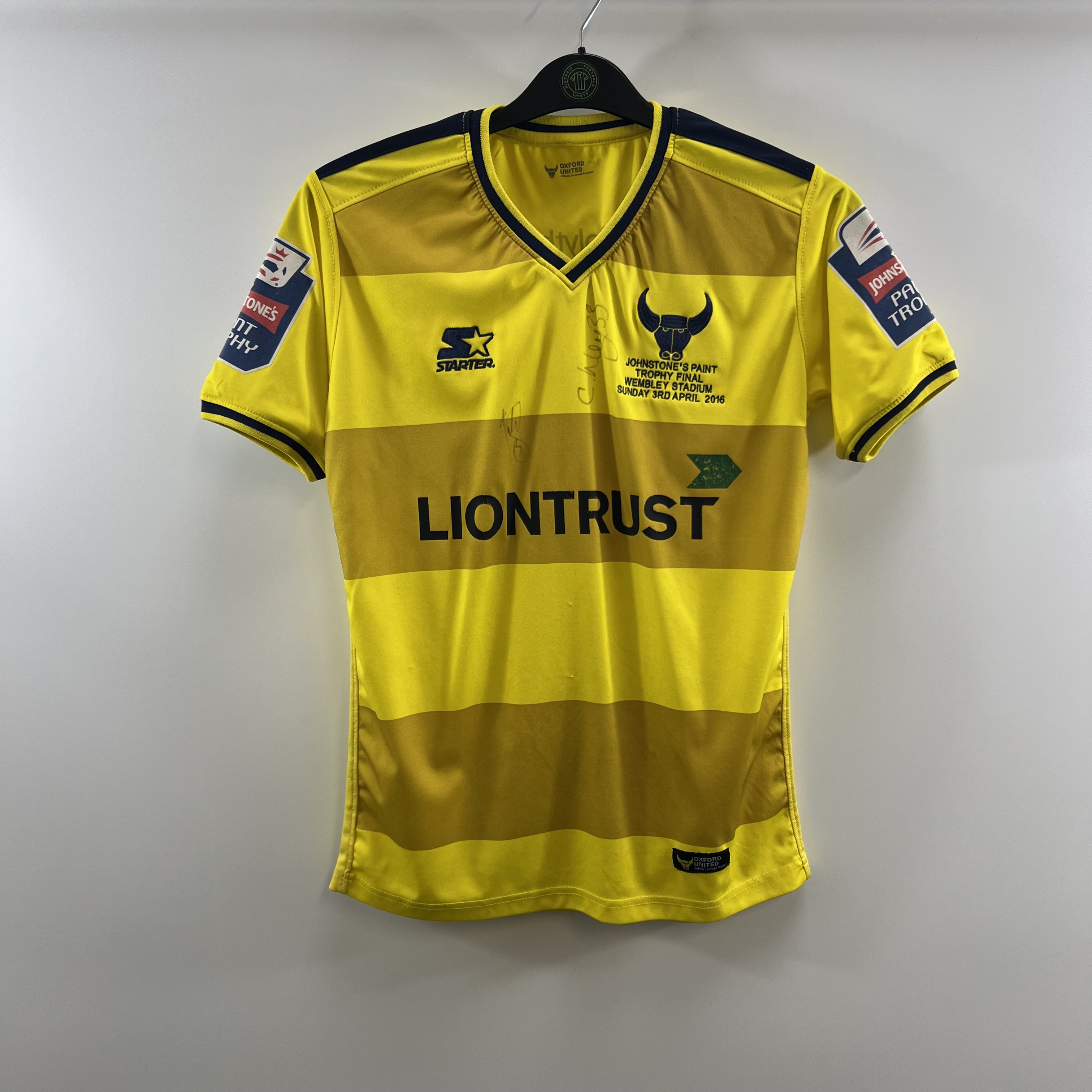 Official Johnstone’s Paint Trophy final sleeve patches, official match detail embroidery under crest. Officially signed by 2 players unidentified.