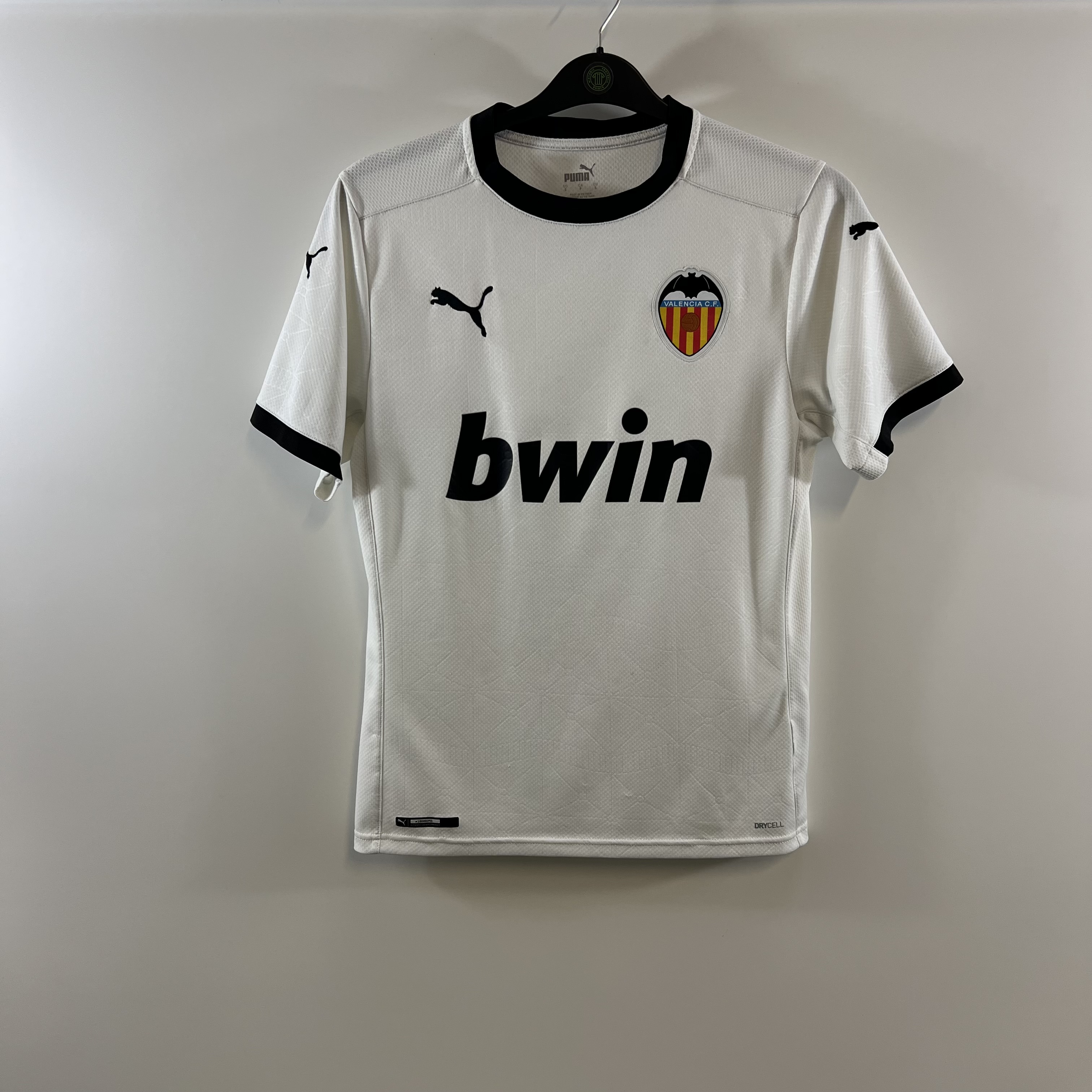 Home shirt as worn when Los Murciélagos struggled to a 13th place finish in La Liga and exited the Copa del Rey at the Round of 16 stage. The undoubted highlight of the season was a 4-1 comeback victory over Real Madrid at the Mestalla, with young Spanish striker Carlos Soler scoring his first career hattrick.