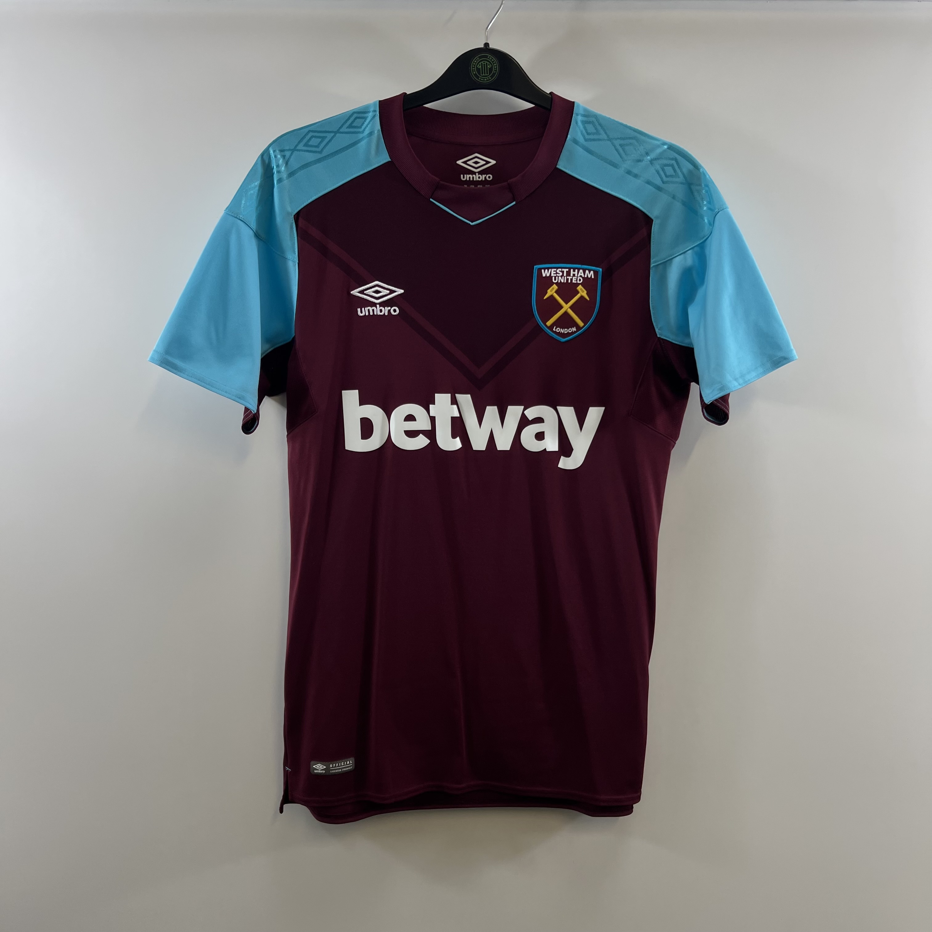 Home shirt as worn during a difficult season for the Hammers as manager Slaven Bilić was replaced by David Moyes in November. The unpopular appointment of Moyes and a run of losses led to unsavoury scenes at the Olympic Stadium as fans protested against the club owners. The side eventually finished 13th in the Premier League and crashed out to Wigan in the FA Cup Fourth Round.